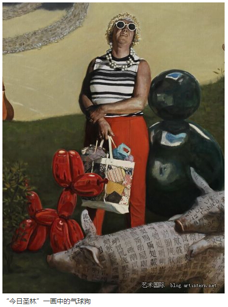 今次不想纠缠沃霍尔,而是想聊侃一下当代艳俗艺术的领头人杰夫·昆斯。我在“今日圣林”一画中选了他的代表作“气球狗”,这是1994-2000年间他搞的一件装置,曾在伦敦英国皇家美术学院展出过。包括一只狗和一只月亮,是否有中国“天狗吃月亮”的隐意,不得而知。都是巨大尺寸:前者为307X363X114cm,后者为311X311X99cm,在“今日圣林”中由于构图需要,我将它缩小了很多,如果原作真是这么小尺寸,就显不出昆斯的魅力了。