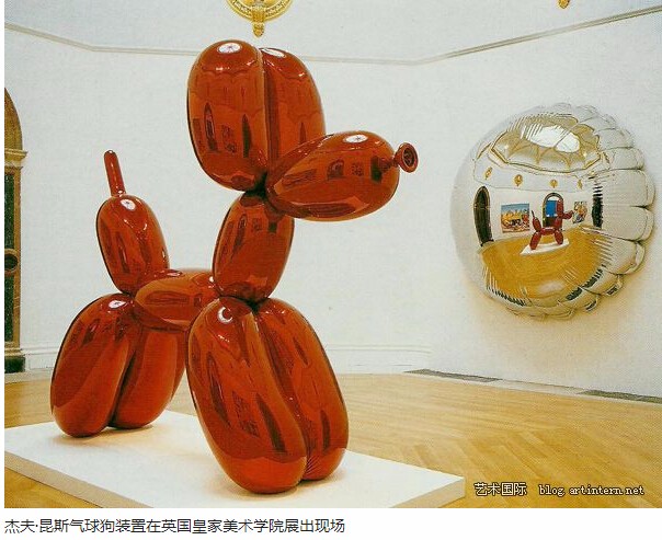 回过头来看杰夫·昆斯的气球狗,你就会发现,他作为当代艳俗艺术的大腕,毕竟要技高一筹。你和上述得奖作品一比便可明显看出,他的气球狗和月亮,造型简单明了、醒目、强烈,一下就抓住你的眼球,少了不少俗气,添了更多“艺术”味;更重要的是,他使用的材料不是气球,而是用高强度镀铬的不锈钢做成,外贴透明颜色薄膜,猛一看很像气球,而其平滑和光洁度远胜气球,给了人一种全新的视觉质感。